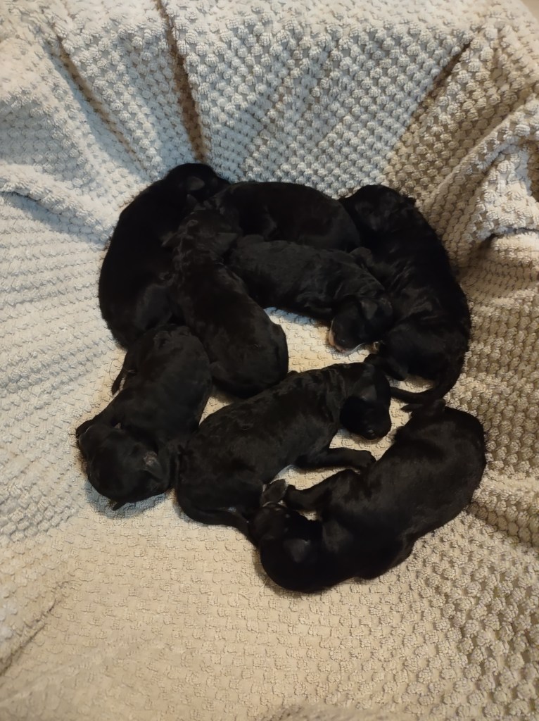 On 4/14/2025 Scout began to show signs of labor at around 8:00pm. She remained a calm mama and did a great job delivering each puppy over the next four hours. Through the process came eight beautiful, healthy Aussiedoodle puppies.